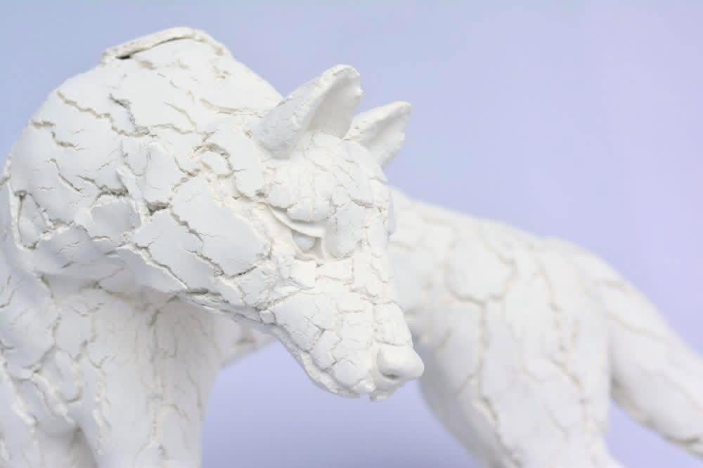流木を支持体に、アクリル絵具と胡粉を用いて制作される作品は、解放と閉塞、二次元と三次元の相反する要素から構成されています。