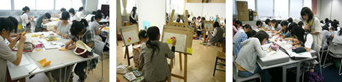 7月21日(木)~23日(土)の3日間、中学3年生対象の「夏季講習会」が行われました。この企画のテーマは「この夏、女子美生になる!」です。美術実技(絵 画・デザイン・基礎実技)はもちろん、学科の授業や在校生との触れ合いを通して本校の学校生活を体験してもらいました。より女子美の生徒としての印象を深めてもらうため、通常の登校時間や授業時間で生活したり、3日間だけの担任をつけたり、部活や学校行事の解説を在校生から聞いたりして、本校を知る上で良い機会であったと思います。