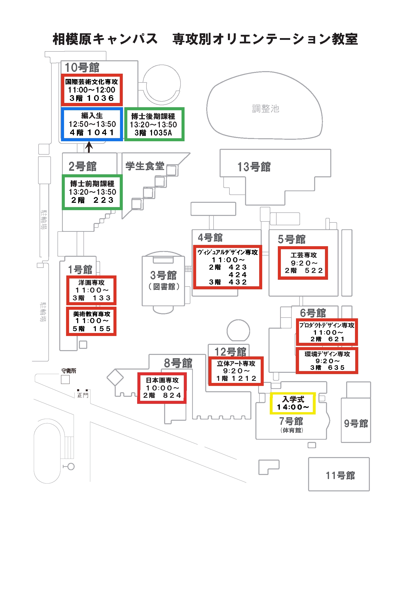 ※オリエンテーションおよび入学式に伴い、臨時便を運行いたします。バスダイヤはこちら( 相模大野駅発着 / 古淵駅発着 )専攻別オリエンテーション(芸術学部新入生)/4月5日(日)2限_(各専攻指定場所)※日本画・立体アート・環境デザイン・工芸は1・2限に実施