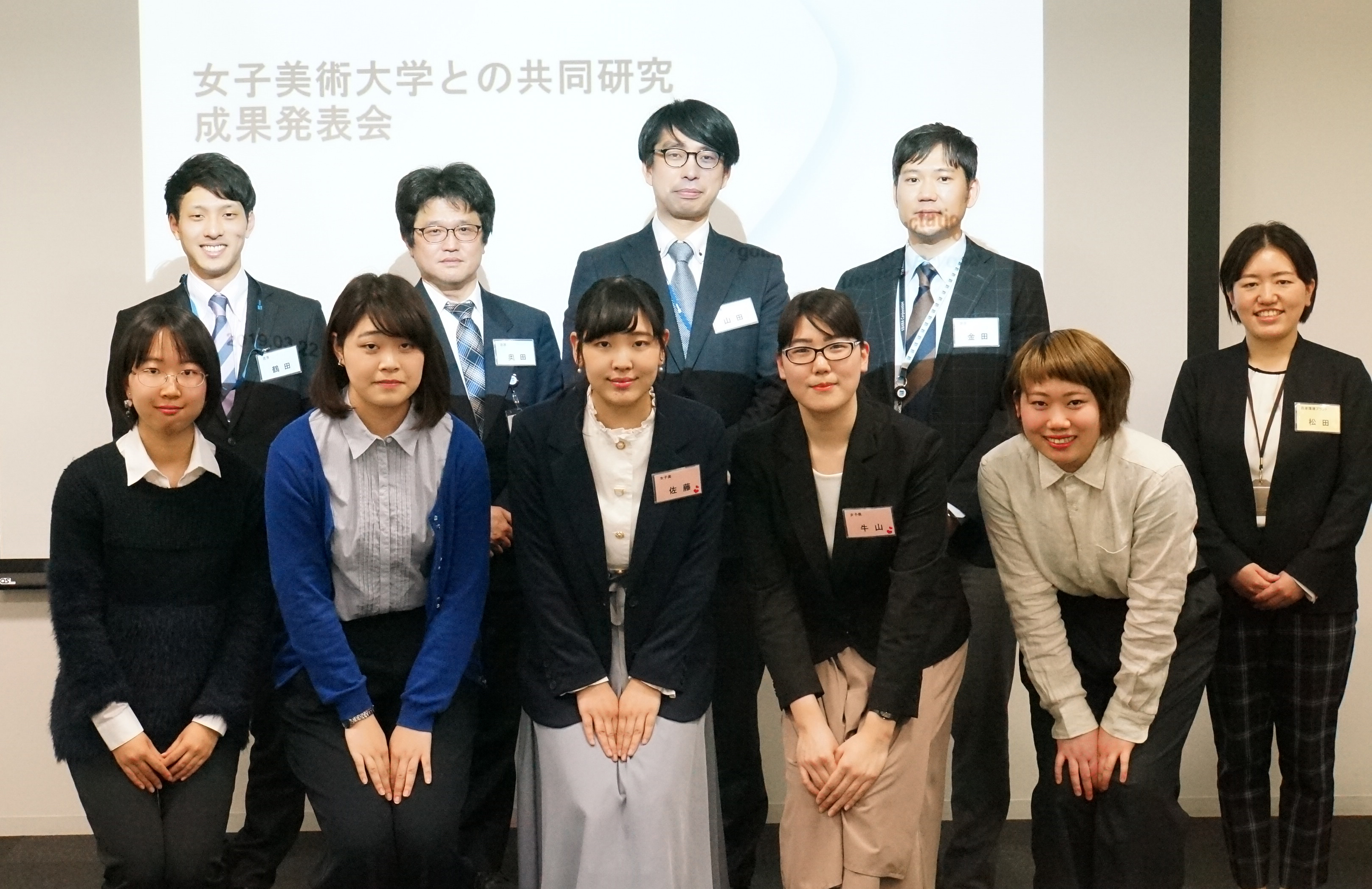 成果発表会では荏原製作所(以下:荏原)前田東一社長による開会のご挨拶、プロダクトデザイン専攻主任松本博子教授からの挨拶・今回の共同研究の概要説明が行われた後「環境啓発イベント企画」・「ポンプ関連の製品デザイン」のテーマについて、成果発表が行われました。成果発表ではそれぞれのテーマについて、既存の製品を使ったときに感じた課題・問題点を考察した上で、「安全性・使いやすさ・親しみやすさ」の様々切り口で女子美生が考える新しいアイデアの提案が発表されました。全テーマの成果発表の終了後は、会場内に展示された作品を囲み、荏原の社員の方々と女子美の学生との意見交換が行われ、「意匠・デザイン分野で大学との共同研究は初の試みであったが、斬新でインパクトのある提案で大きな成果があった」や、「今回のアイデアをさらに進め、実際の製品化にも期待したい」とのコメントをいただくことができました。今回の共同研究に参加した女子美の学生にとっては、実際の社会で使用されている既存のサービス・商品に、自らのアイデア・新しい価値を付け加えることを実践的に経験する貴重な機会となりました。