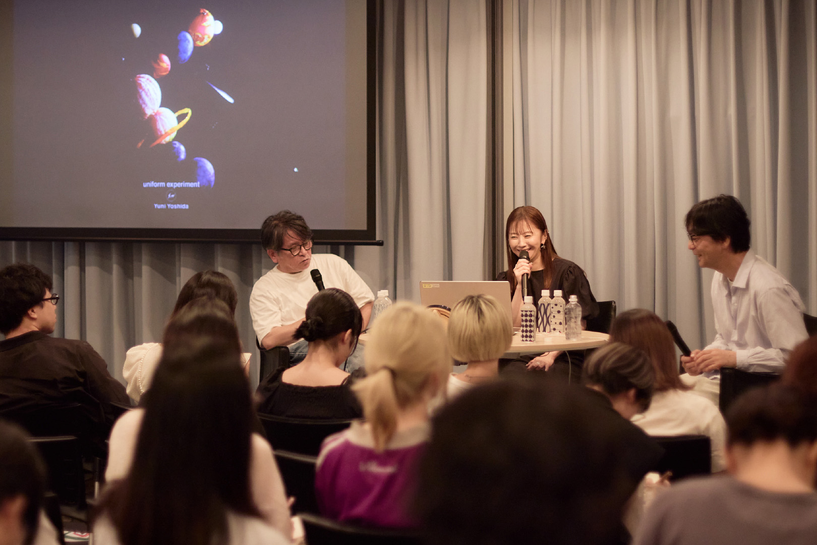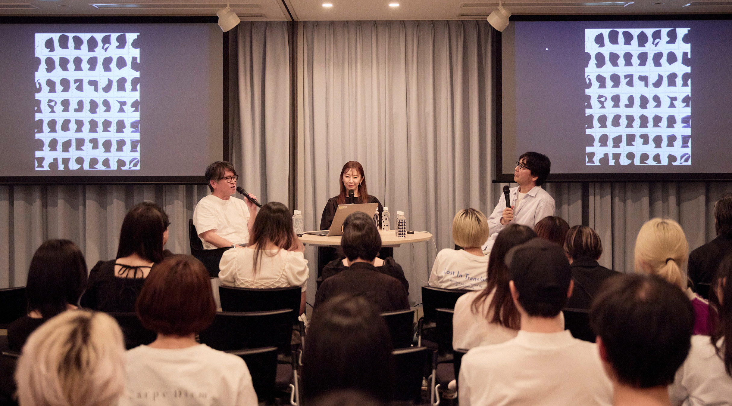 亀倉雄策賞の受賞対象にもなった本学の学生募集ポスターデザインを、約20年にわたり手がけてきた林先生。そのデザインの変遷や、制作の裏側にある思考や試行錯誤、そしてひとりの作家としてグラフィックデザインに向き合い続ける姿勢が語られました。また、吉田ユニ先生と服部一成さんによる制作エピソードや、三者のあたたかな関係性にも話が及び、時にユーモアも交えながら、刺激に満ちたトークが繰り広げられました。