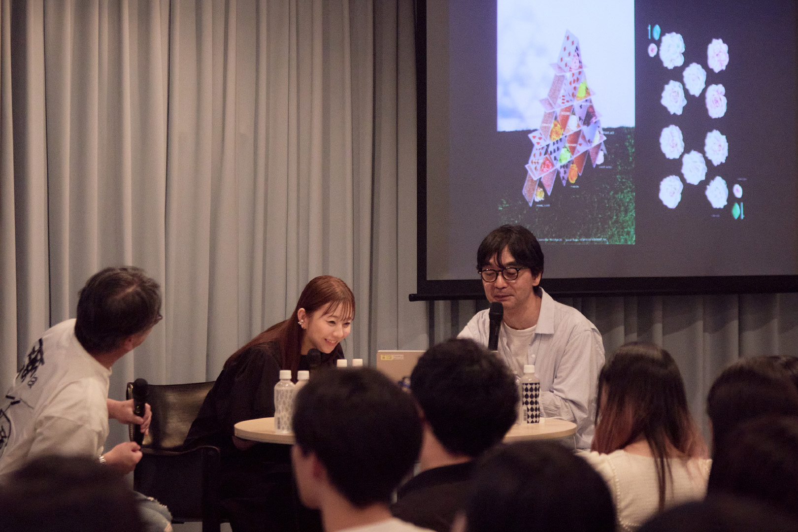 林先生に加え、本学客員教授の吉田ユニ先生、アートディレクターの服部一成さんを迎え、約1時間半にわたって行われたトークセッションでは、受賞作やデザインにまつわる貴重なお話が展開されました。会場には100人近くの観覧者が詰めかけ、大盛況となりました。